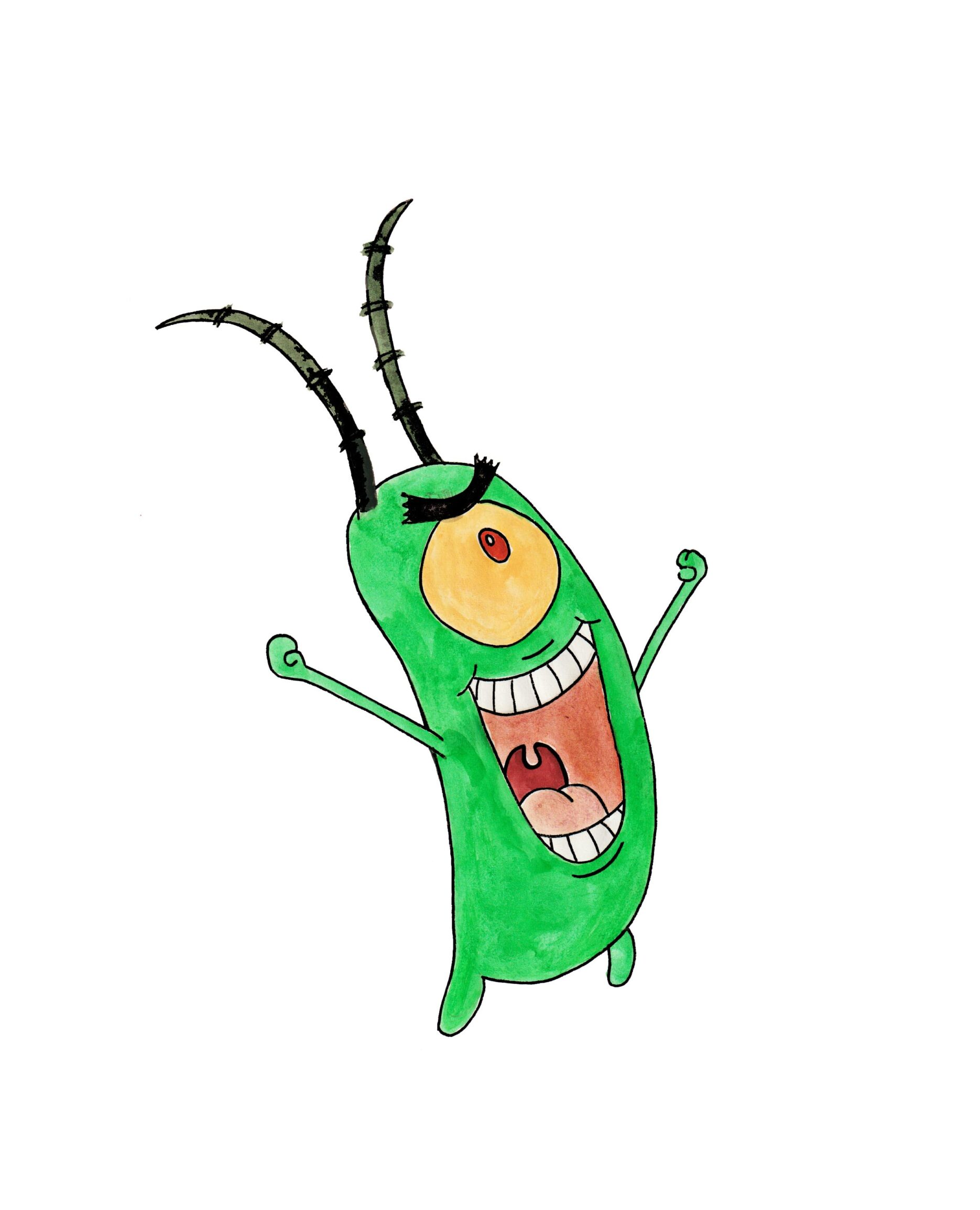 Plankton is, as his name suggests, a tiny deep green planktonic copepod who can fit in the palm of one’s hand. He has some stubby appendages and one yellow eye with a red pupil and a white (sometimes pink) highlight.